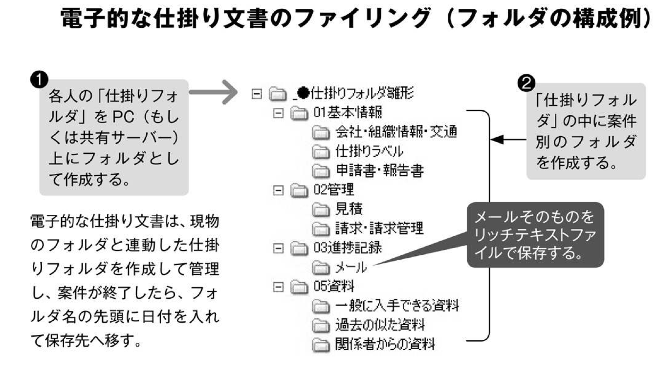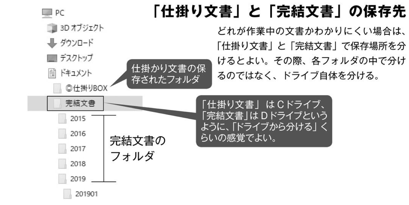パソコンの中では「仕掛り文書」のフォルダを「仕掛りBOX」とし、その中に案件別の「仕掛りフォルダ」を作成して収めてください。