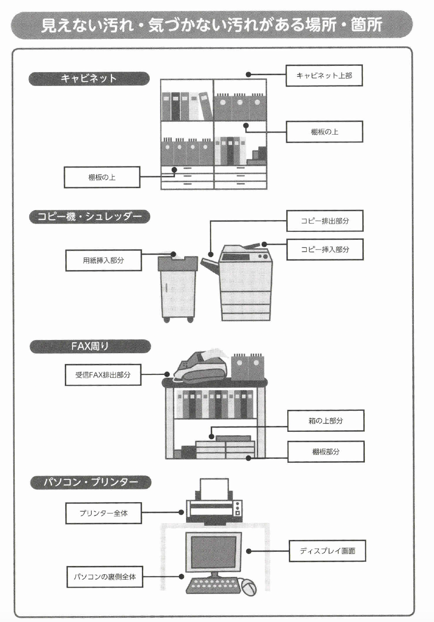 キーボード・プリンター、電話機、シュレツダーの挿入部分および周辺の切断カス、床に落ちているパンチカス、ホワイトボードの受け皿、イレーザー、キャビネットの棚板(特に一番下の棚板)、テーブル、椅子、ボードなどの脚部分、コンセント、壁・ドアノブ、表示物、ゴミ箱、窓ガラス、扉など