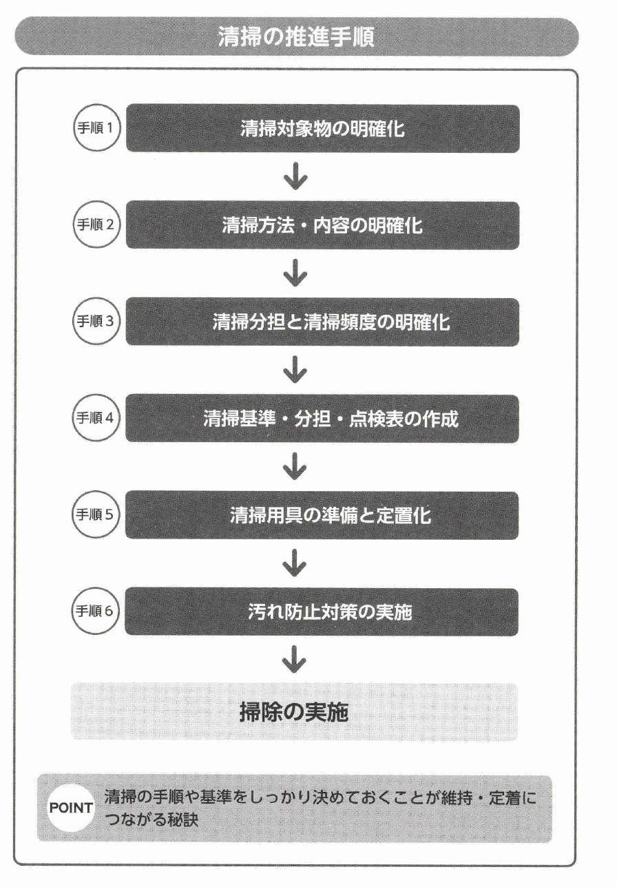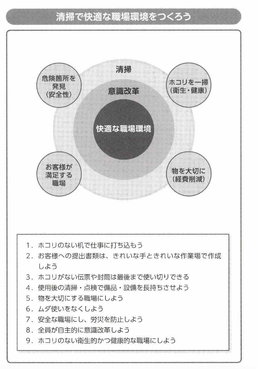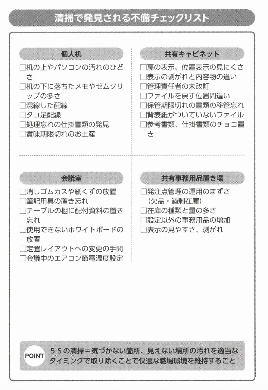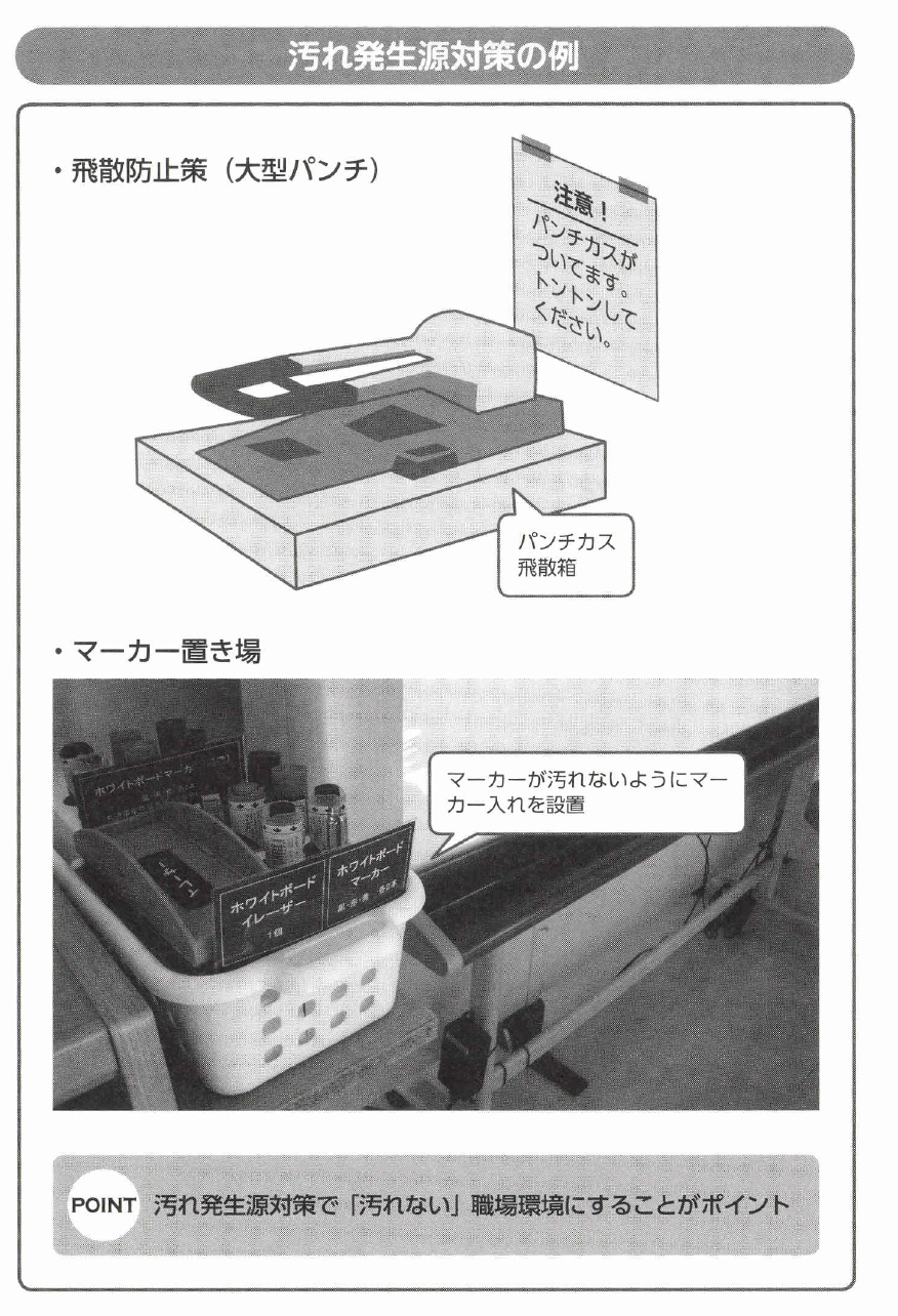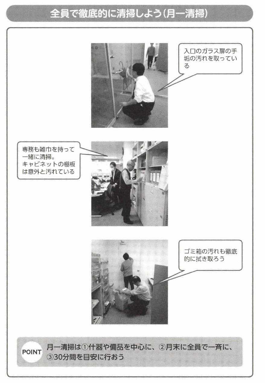 POIN丁①全員で清掃の目的をよく理解しよう②自分の業務の一環として清掃を実施することが当たり前と思う風土にしよう③清掃タイムを設け、管理職も一緒になって全員で清掃できるしくみをつくろう④必要な清掃用具はすぐに使える状態で管理しよう⑤定期的にルール(清掃基準・分担・点検項目)を見直そう⑥汚れの発生源対策(シュレッダーカス、パンチカス、ホコリ)を実施しよう②見えないところ、気がつかない箇所まで徹底的に清掃しよう③机の上、床の上、什器をピカピカにしよう⑨一人ひとりが汚さない、汚したらすぐ清掃する習慣を身につけよう⑩汚れ、ゴミに気づいたらすぐに拭く、拾うことが当たり前になろう①清掃点検を、5Sの不備発見と改善の機会として有効活用しよう