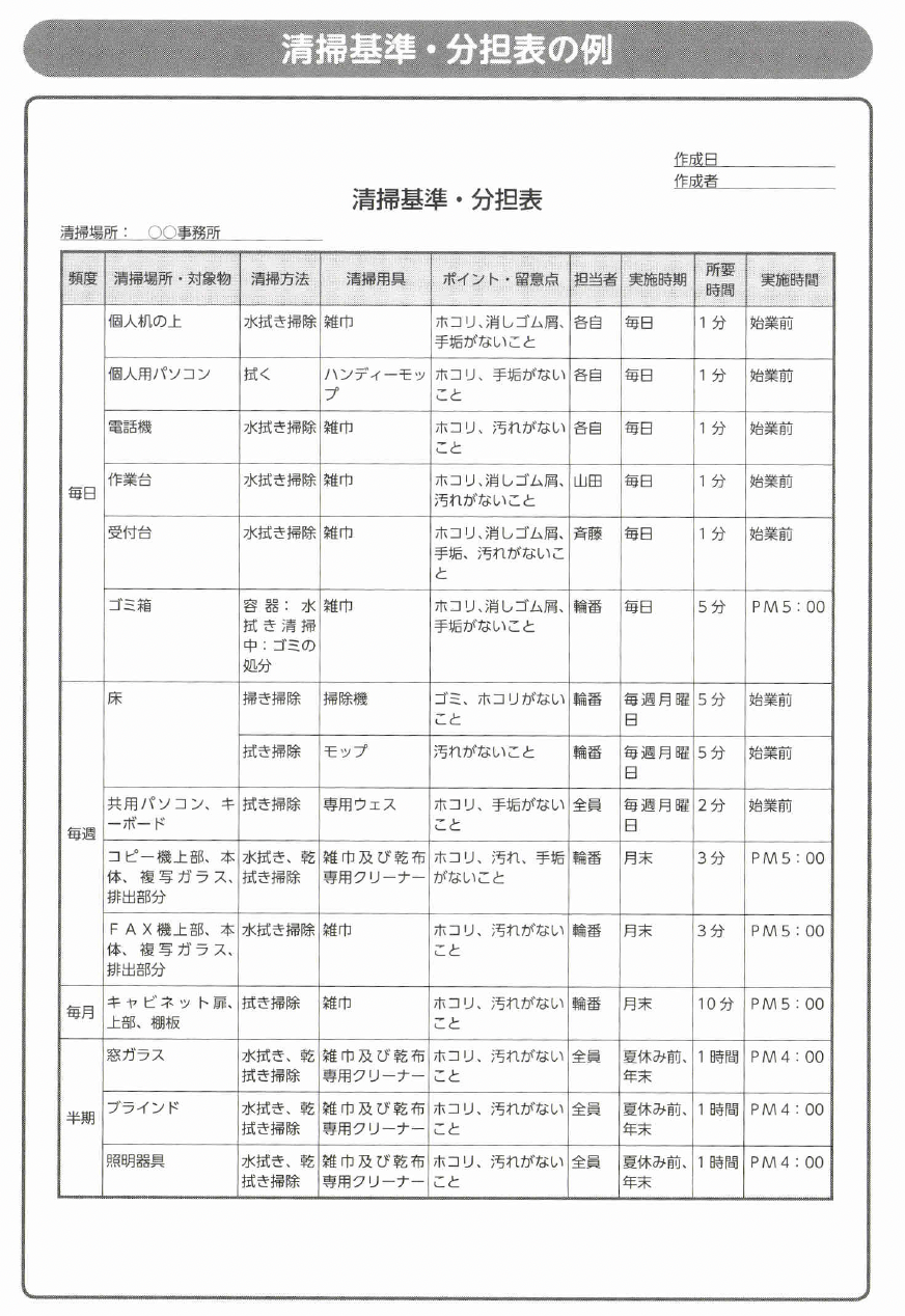 清掃基準・分担表には、どの箇所を、どのような清掃道具を使用して、どのような清掃方法で、誰が、いつ、どこを、どの位の時間をかけて清掃するのかを具体的に決めて記載します。