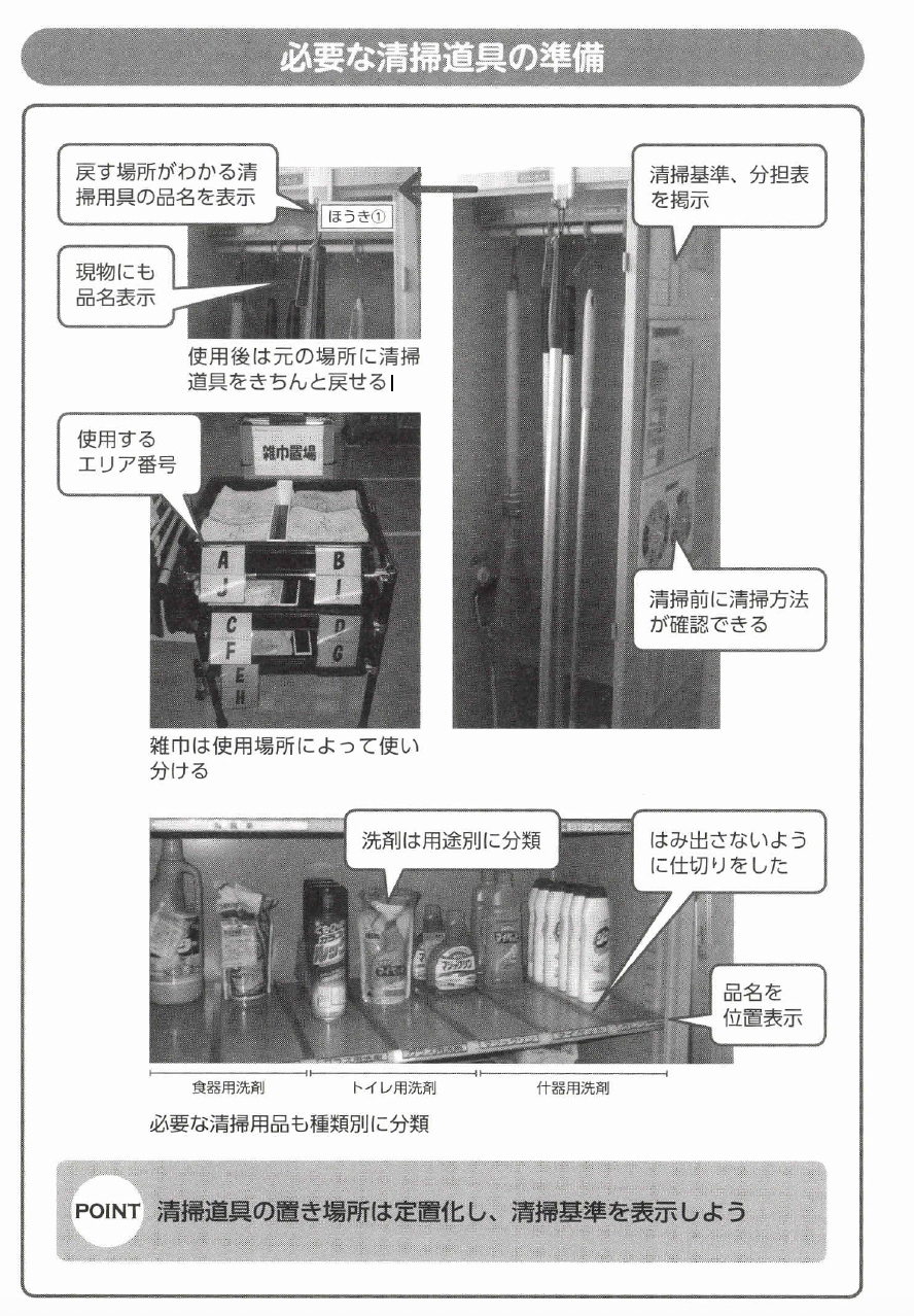 目備囲嘔清掃用具の準備と定置化最適な清掃をするためには、最適な清掃用具が必要です。