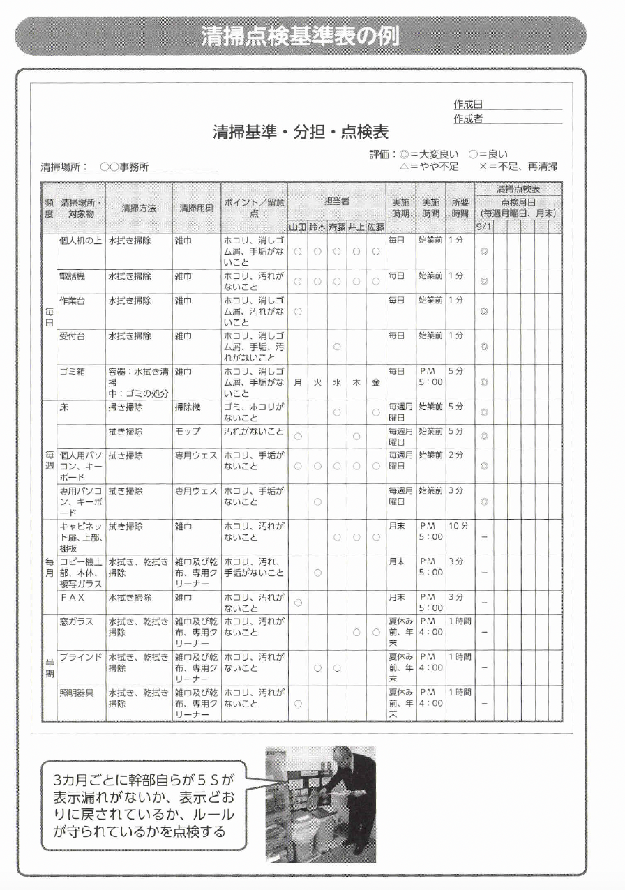 自宅であればそれでよいかもしれませんが、快適な職場づくりのためには、全員が同一のレベルで決められたルールどおりに清掃しなければなりません。