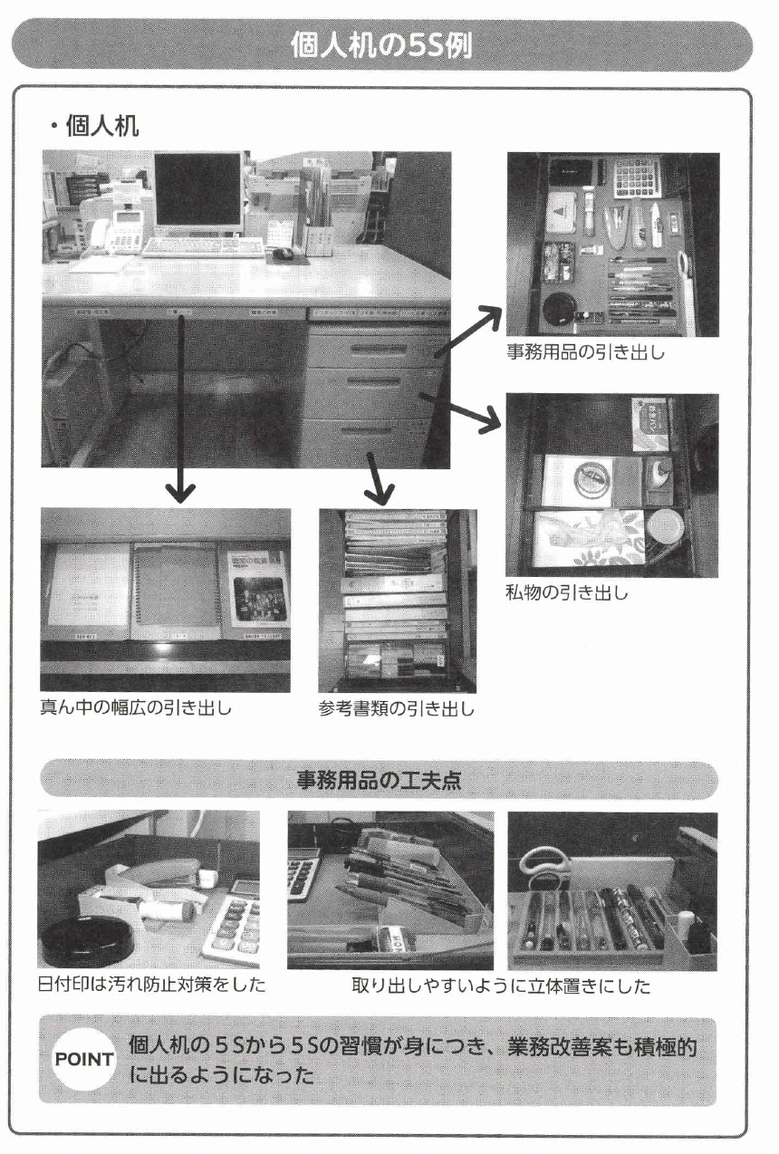 個人机の5Sから決められた場所にきちんと戻す習慣がつくと、仕事の手順やルールも守られ、さらに一人ひとりから業務改善提案も積極的に出るようになったそうです。