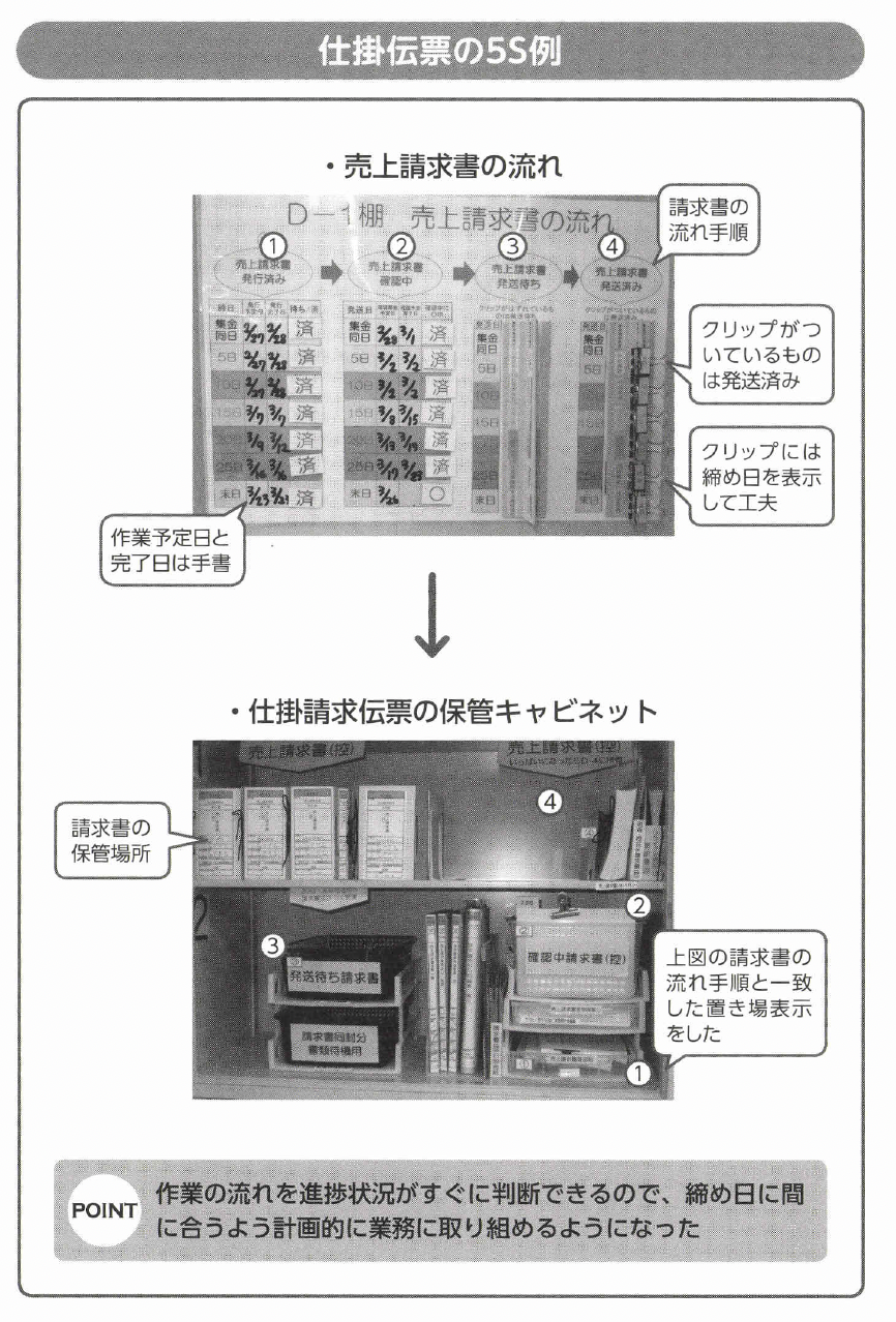 請求書の仕掛伝票を保管する場所は、手順に連動できる置き場にし、手順番号と仕掛の状態、作業手順を表示し、誰でも保管場所で作業の流れがわかり、進捗状況が判断できる置き場にしました。