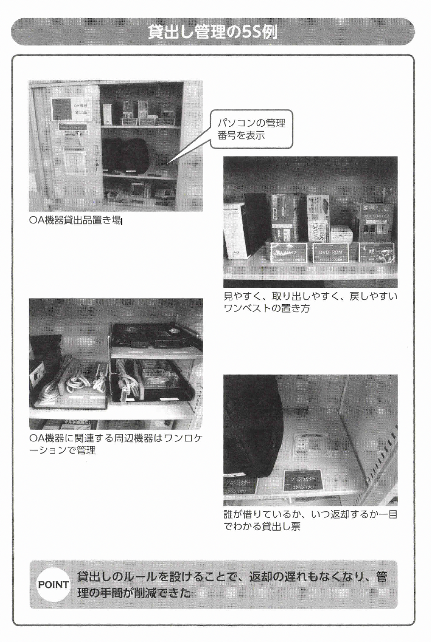 OA機器の貸出しの管理工数の削減と、期限どおりに戻す意識を徹底するために、OA機器の貸出し管理の5Sを行いました。