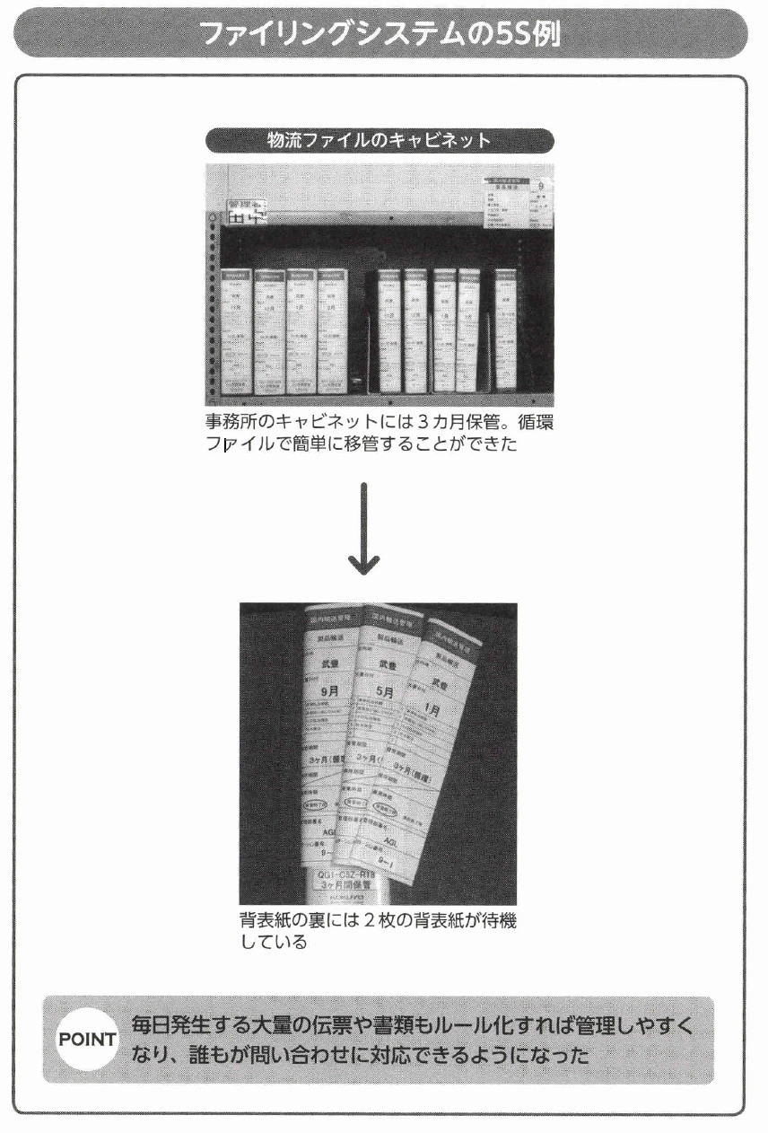 ①誰が、どのような仕事を分担しているのかわかる②誰もが問い合わせにスピーディに対応できる③情報の共有化が図られる④書類の移管が簡単にできる職場全員で相談し、自分が担当している業務や書類の棚卸しを行い、物流部門の仕事のプロセスを明確化して、ファイリングシステムの体系をつくりました。