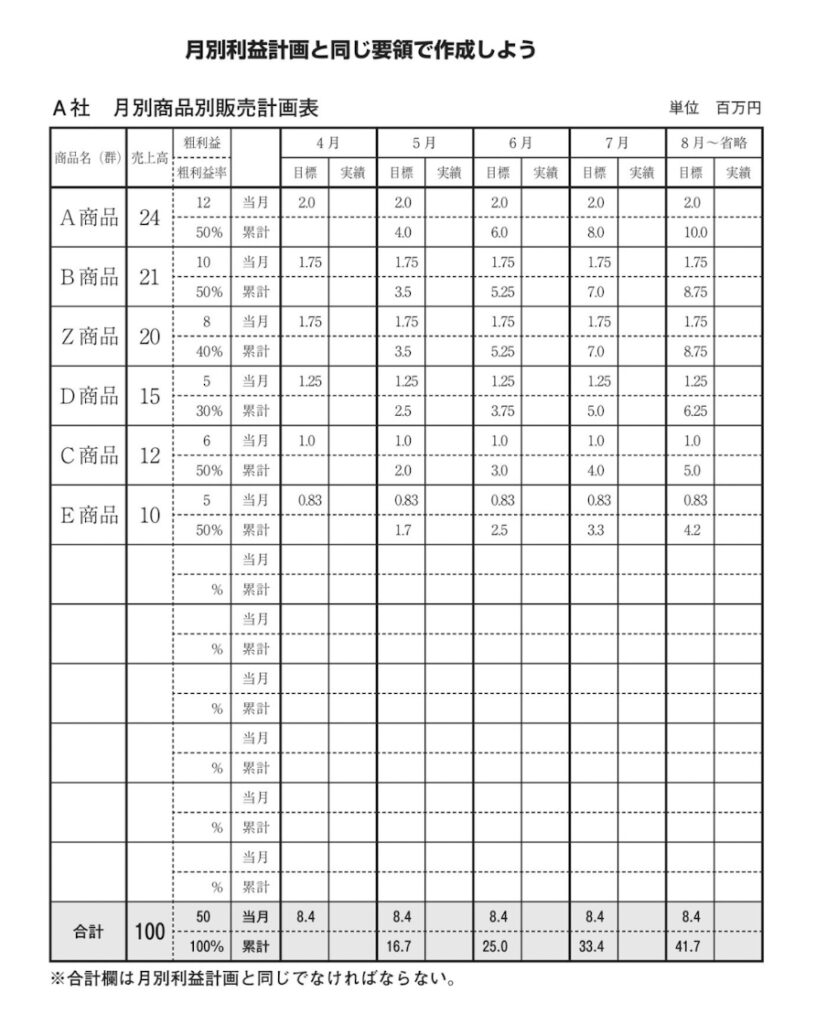 粗利益率が、商品構成で極端に違うのです。この場合は、最初に商品群別販売計画を作成後、それぞれの商品群ごとに商品別販売計画を作成してください。