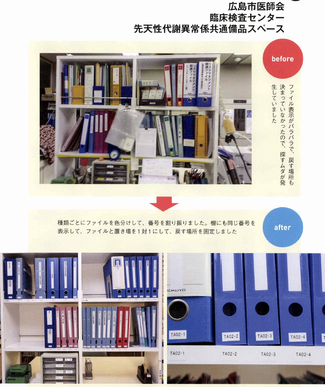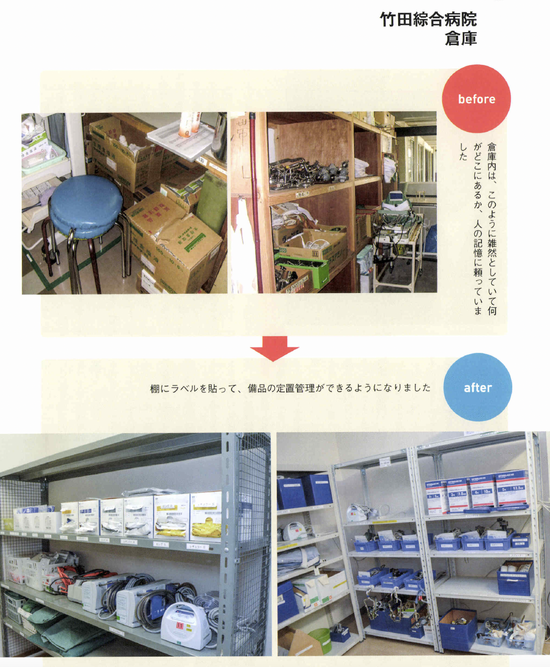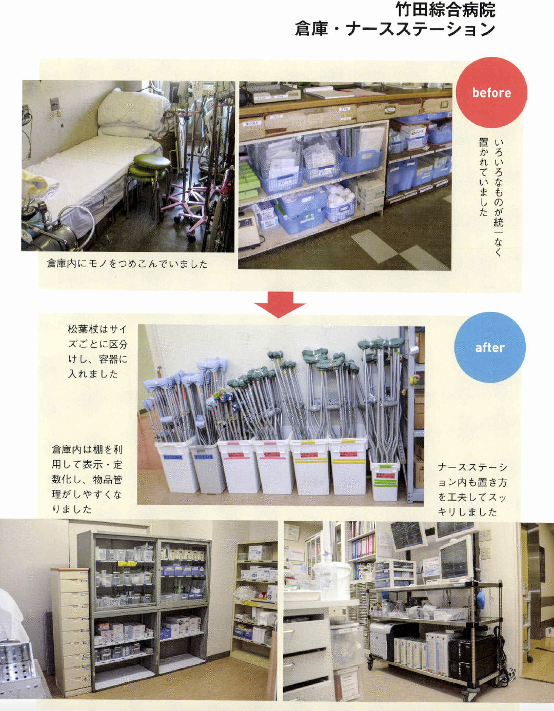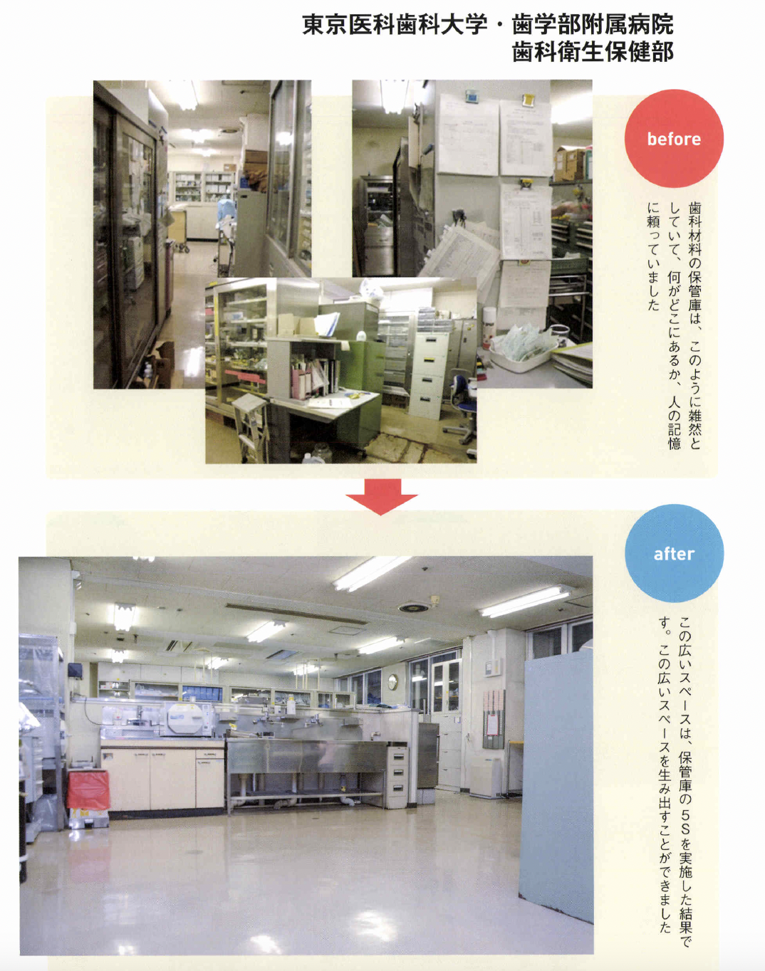 るためにどうするかは理解し てもらっていないように感じます。 5Sは、ただ片付ければいいと いうわけではありません。組織的 に、誰がやつてもできる体制こそ が大切で、ここまでやらないと定 着化したとはいえません。その神 髄を全員が理解することが難しい のです。 ――自分の職場だけでも、5Sを やつてみたいという人も多いでし よう。その人たちにひと言。 高原 もちろん医療機関全体の活 動としてトップダウンで導入する にこしたことはないのですが、そ うはいかない現場もあります。そ んな人たちにお勧めしたいやり方 があります。 医療機関の方針ではないのです から、日常業務として5S活動は できません。業務を優先するのが 当たり前ですから、遅々として、 なかなか進捗しないこともあるで しよう。しかし、そこであきらめ て、投げ出したりしないようにし てください。 とくに、5S でもっとも時間を要するのが整理です。初めての経 験で基準がないのですから、「要 る。要らない」の判断はとても難 しくなります。そこで、この打開 策としてお勧めしたいのが「限定 してやる」ことです。「まず、この 棚だけやろう」というやり方です。 本来、医療機関全体でやるので あれば、 一斉に整理を徹底します。 しかし職場だけでやる場合は、整 理と整頓までを1クールで進めま す。整頓をしていると、整理で足 りなかったこと、やりきれなかっ たことが見えていきます。そこで 整理に戻ってやり直します。限定 した範囲ならば、戻ることもさほ ど手間ではありませんc 最初は常に悩むものです。悩ん でしまうと、活動が止まってしま います。コツコツと慌てずに、話 し合って基準をつくりながらやっ ているうちに、5Sのコツがつか めようになります。モデルづくり ですね。そして限定した5Sをや り遂げたら、そのモデルやルール を次の対象に水平展開して広げて いけばいいのです。いきなり一度 に全部をやるのはムリな話です。 すべてを中途半端にやると失敗し ます。そして、やり方の悪さは反 省せずに、5Sそのものを否定し てしまうことになりかねません。 だからこそ「限定」してやること が重要なのです。 究極の姿は業務の5S IIモノの5Sの次には、業務の 5Sをやりなさいと言われていま す。その意味は? 高原 医療5Sの究極の価値とは 医療安全にあります。確かに、モ ノの5Sで医療安全は担保できま すが、それだけでは不十分です。 それは、仕事の進め方そのものに ミスが内在しているからです。た とえばコミュニケーションの不足、 手順の間違い、伝達のミスなど、 これらが元となって医療事故が発 生してしまいます。医療事故のタ ネが業務そのものにあるのですか ら、モノの5Sだけで解決しよう とするのはムリな話です。モノも 仕事も、放っておくとドンドン増 えてしまいます。定期的に整理を して減らしていかないとミスを見 逃してしまう職場となってしまい ます。 こうして考えてみると「モノの 5S」は医療サービスの提供側、 つまり医療機関の立場から見た活 動です。仕事がやりやすくなる、 コミュニケーションが良くなるな どは、医療機関側の成果ですね。 しかし、本来は患者、医療サービ スを受ける側の目で見つめるべき ではないでしょうか。患者の視点 で業務のあるべき姿を見直して、 業務そのものを変えていく、それ こそが業務の5Sであり、その視 点からPDCAを回して改善につ なげていくのです。 業務の5Sは、モノの5Sの完 成形です。竹田綜合病院では、年 間1200件もの改善提案が出さ れています。あるべき姿と現状と を比較して、顧客サービスの視点 から5Sを実践するためにも、ぜ ひ業務の5Sまで進んでいってほ しい。やってみると、たぶんこれ までにない大きな成果を実感でき るでしょう。そしてそれが、次の 糧へとつながっていくのです。