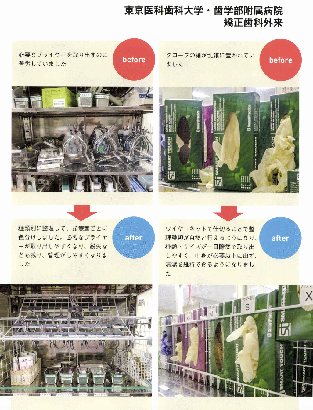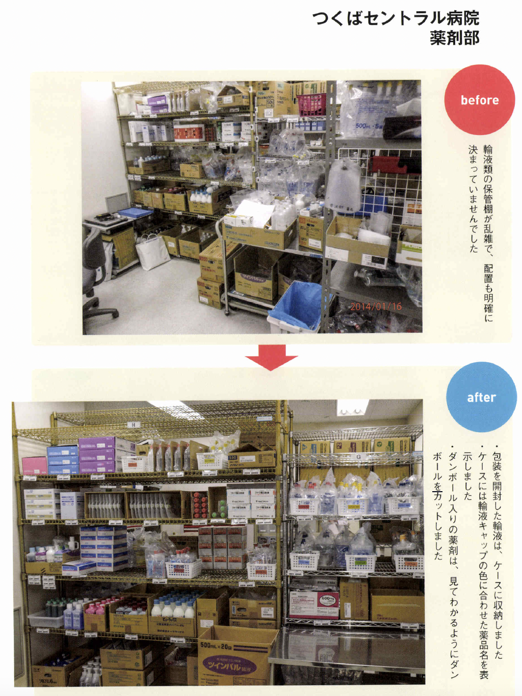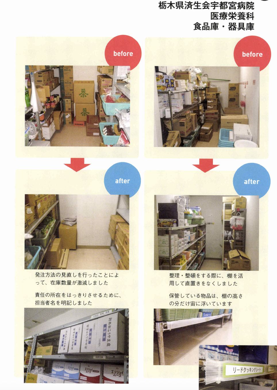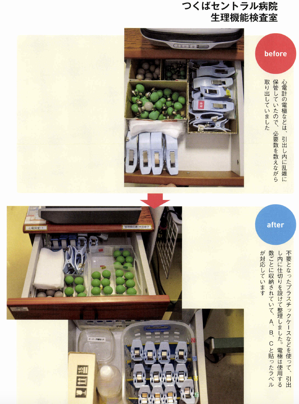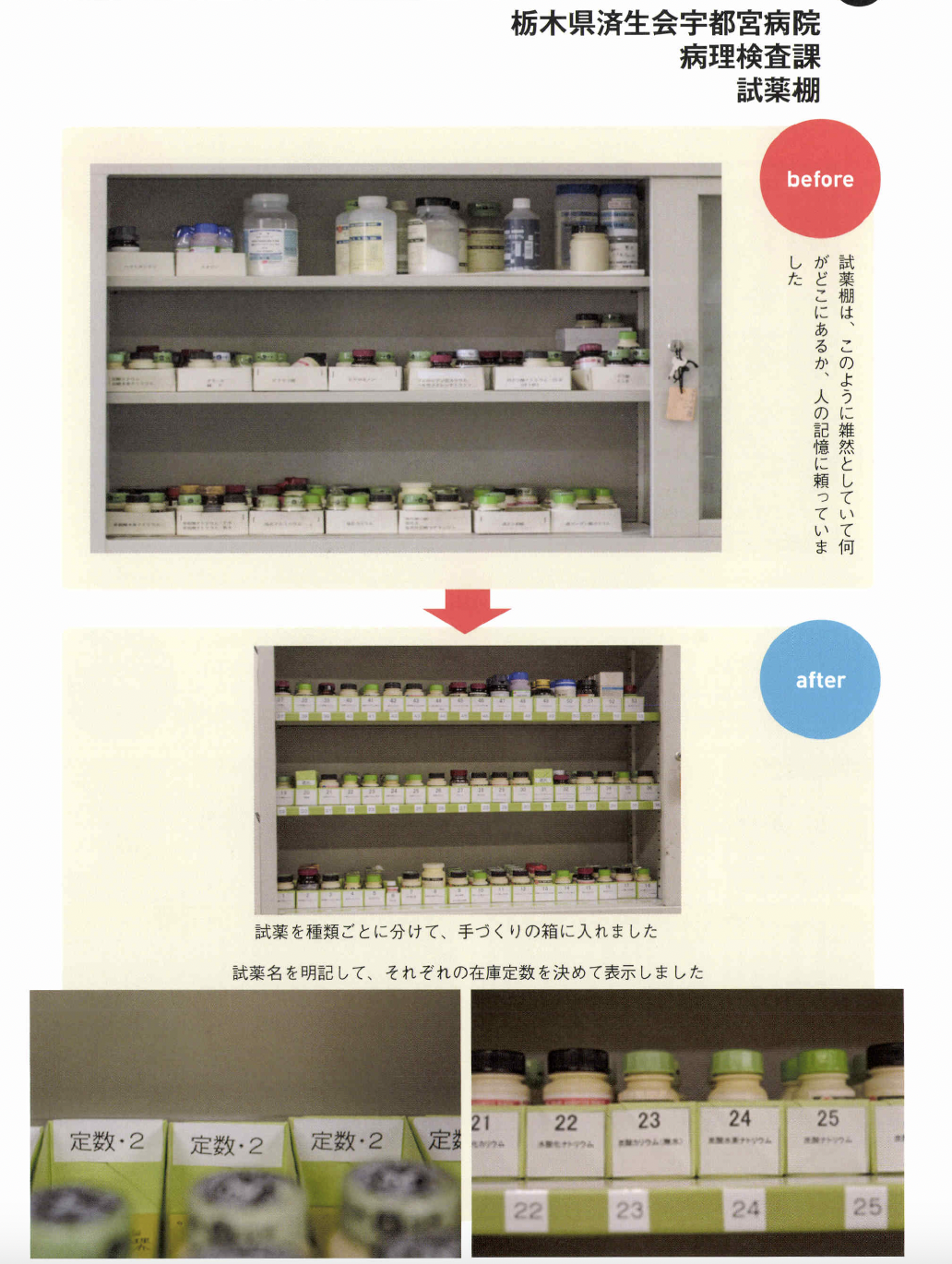 るためにどうするかは理解し てもらっていないように感じます。 5Sは、ただ片付ければいいと いうわけではありません。組織的 に、誰がやつてもできる体制こそ が大切で、ここまでやらないと定 着化したとはいえません。その神 髄を全員が理解することが難しい のです。 ――自分の職場だけでも、5Sを やつてみたいという人も多いでし よう。その人たちにひと言。 高原 もちろん医療機関全体の活 動としてトップダウンで導入する にこしたことはないのですが、そ うはいかない現場もあります。そ んな人たちにお勧めしたいやり方 があります。 医療機関の方針ではないのです から、日常業務として5S活動は できません。業務を優先するのが 当たり前ですから、遅々として、 なかなか進捗しないこともあるで しよう。しかし、そこであきらめ て、投げ出したりしないようにし てください。 とくに、5S でもっとも時間を要するのが整理です。初めての経 験で基準がないのですから、「要 る。要らない」の判断はとても難 しくなります。そこで、この打開 策としてお勧めしたいのが「限定 してやる」ことです。「まず、この 棚だけやろう」というやり方です。 本来、医療機関全体でやるので あれば、 一斉に整理を徹底します。 しかし職場だけでやる場合は、整 理と整頓までを1クールで進めま す。整頓をしていると、整理で足 りなかったこと、やりきれなかっ たことが見えていきます。そこで 整理に戻ってやり直します。限定 した範囲ならば、戻ることもさほ ど手間ではありませんc 最初は常に悩むものです。悩ん でしまうと、活動が止まってしま います。コツコツと慌てずに、話 し合って基準をつくりながらやっ ているうちに、5Sのコツがつか めようになります。モデルづくり ですね。そして限定した5Sをや り遂げたら、そのモデルやルール を次の対象に水平展開して広げて いけばいいのです。いきなり一度 に全部をやるのはムリな話です。 すべてを中途半端にやると失敗し ます。そして、やり方の悪さは反 省せずに、5Sそのものを否定し てしまうことになりかねません。 だからこそ「限定」してやること が重要なのです。 究極の姿は業務の5S IIモノの5Sの次には、業務の 5Sをやりなさいと言われていま す。その意味は? 高原 医療5Sの究極の価値とは 医療安全にあります。確かに、モ ノの5Sで医療安全は担保できま すが、それだけでは不十分です。 それは、仕事の進め方そのものに ミスが内在しているからです。た とえばコミュニケーションの不足、 手順の間違い、伝達のミスなど、 これらが元となって医療事故が発 生してしまいます。医療事故のタ ネが業務そのものにあるのですか ら、モノの5Sだけで解決しよう とするのはムリな話です。モノも 仕事も、放っておくとドンドン増 えてしまいます。定期的に整理を して減らしていかないとミスを見 逃してしまう職場となってしまい ます。 こうして考えてみると「モノの 5S」は医療サービスの提供側、 つまり医療機関の立場から見た活 動です。仕事がやりやすくなる、 コミュニケーションが良くなるな どは、医療機関側の成果ですね。 しかし、本来は患者、医療サービ スを受ける側の目で見つめるべき ではないでしょうか。患者の視点 で業務のあるべき姿を見直して、 業務そのものを変えていく、それ こそが業務の5Sであり、その視 点からPDCAを回して改善につ なげていくのです。 業務の5Sは、モノの5Sの完 成形です。竹田綜合病院では、年 間1200件もの改善提案が出さ れています。あるべき姿と現状と を比較して、顧客サービスの視点 から5Sを実践するためにも、ぜ ひ業務の5Sまで進んでいってほ しい。やってみると、たぶんこれ までにない大きな成果を実感でき るでしょう。そしてそれが、次の 糧へとつながっていくのです。