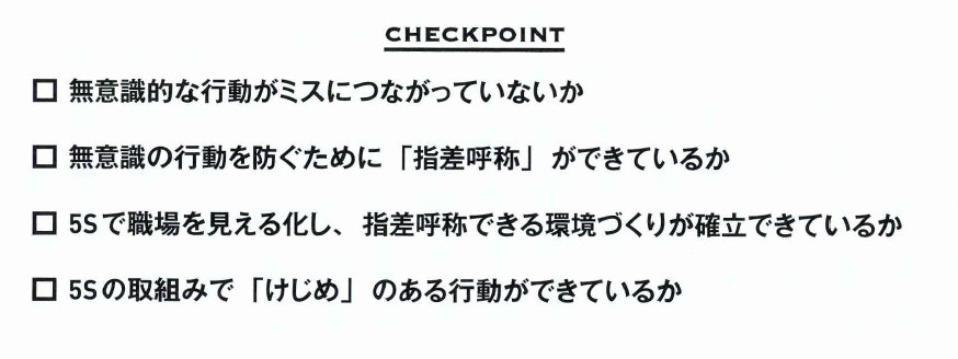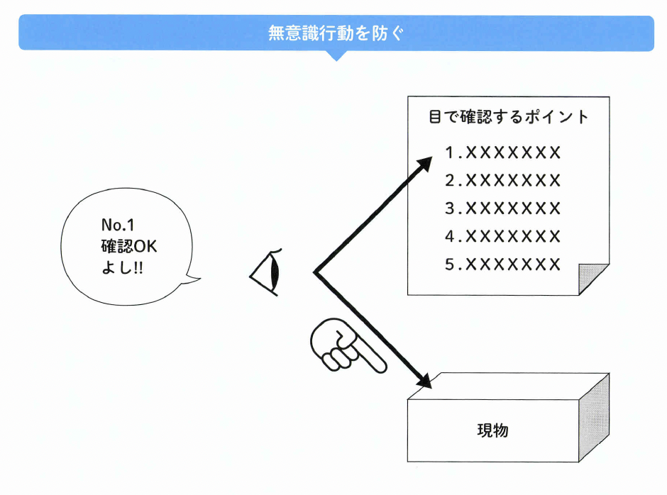 こうしたミスや事故を防ぐには、 無意識を排除することです。その ためには、仕事の各手順ごとに 「けじめをつける」ことを意識し ます。 けじめをつけるためには、習慣 付けが大切です。重要なポイント は、職場の中で仕事の確認を確実 にして、片付けなどを徹底するこ とです。そのようなことを通じて、 仕事にけじめをつけることが重要 なのです。 無意識な行動をしないためによ く活用されるのが、「指差呼称」ま たは「指差し確認」です。チェッ クすべきポイントを指差して「○ ○よし!」と声に出して確認する のです。指差呼称をすることで、 無意識の状況を意識化させること ができます。 ここで重要なのは、確認すべき ポイントを明確にして、可能な限 り表示などで明確化することです。 そのためには、指差呼称すべきポ イントを目で見てわかるように工 夫します。つまり、「日で見る管 理」の考え方を活用することが効 果的なのです。