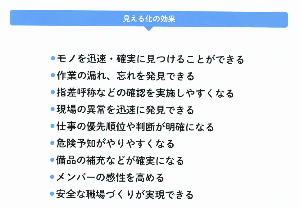 事故やミスを防ぐためには、目 で見る管理や見える化が必要です。 皆さんの職場は見える化ができて いますか? 見える化の対象は、モノだけで はありません。仕事や情報など、 さまざまな見える化が求められて います。実は5Sを展開するこ とにより、さまざまな事柄の見え る化が実現できるようになります。 ここでは代表的な見える化の内容 を説明しましょう。