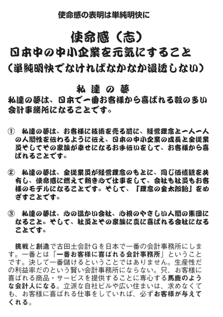 これが古田土会計の使命感です。役職に関係なく、すべての活動や行為は、これに背いてはならないのです。