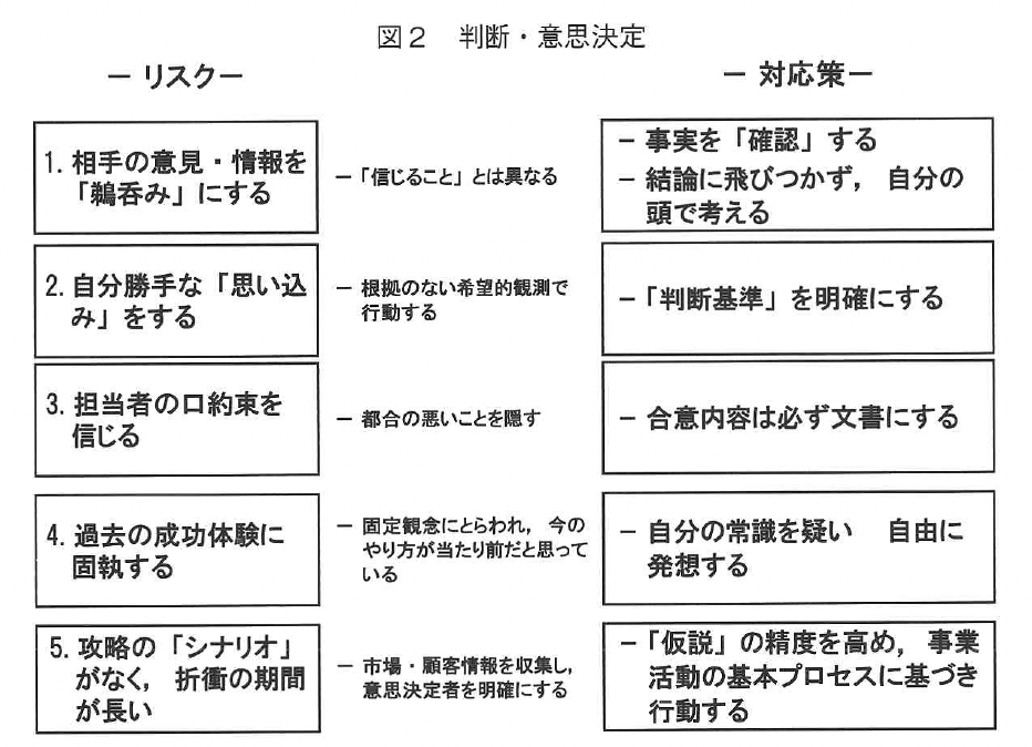 そうした思い込みや殻を破ってあげるのもリーダーの務めだと心得てほしい。そうした努力をせず、先を読めずに、その場しのぎで対応すると、図2判断。意思決定のようなリスクに遭過することになる。