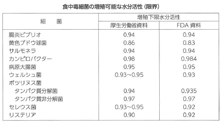 食中毒細菌の多くは0.93~ 0.95が増殖できる水分活性 の下限であるが,黄色ブドウ球菌は0.86まで増殖可能であると言われている。