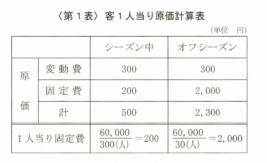 一カ月の固定費は60,000円、変動費は一人当り300円である。このスキー宿の一人当りの原価計算を、シーズン別にしてみると、〈第1表)のようになる。