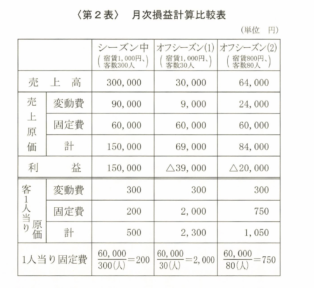 案の定、この宿の経営者は、オフシーズンのサービス料金として、800円の宿賃を打ちだした。この結果、80人の客があった。その損益計算と原価はどうなったのだろうか。前の二つの場合とならべて検討してみよう。(第2表)がそれである。