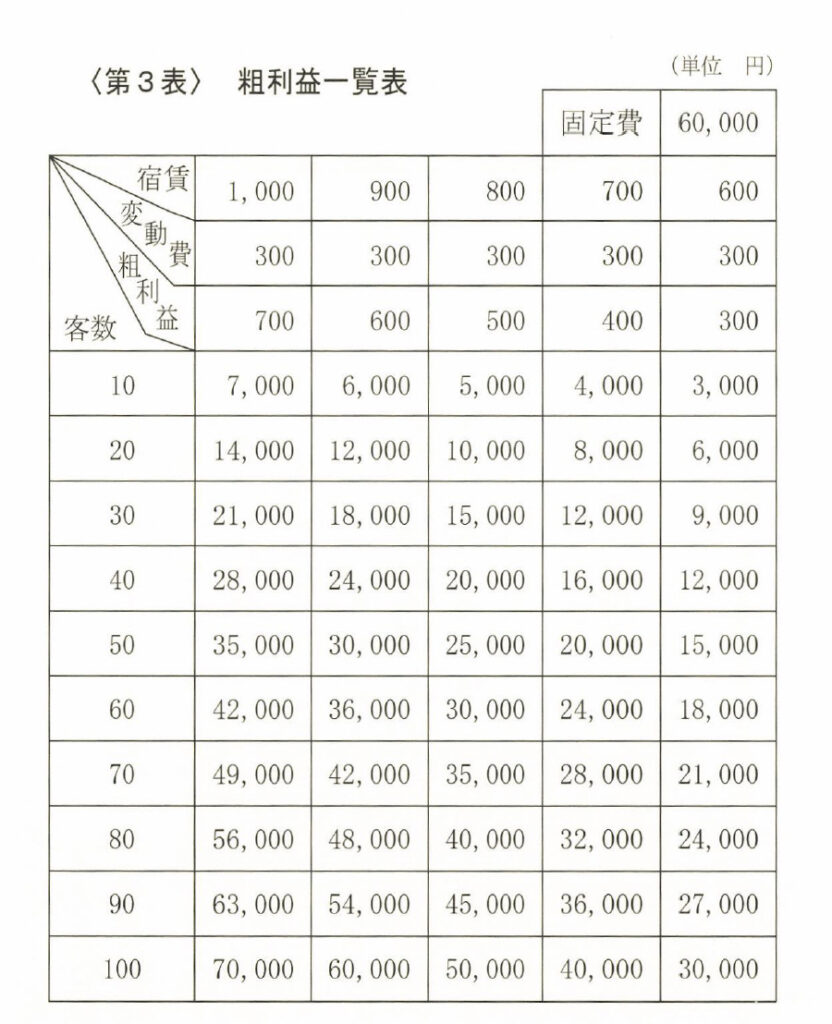 〈第3表〉をご覧願いたい。客数と宿賃の変化によって、粗利益がどう変るかが一日で分る。