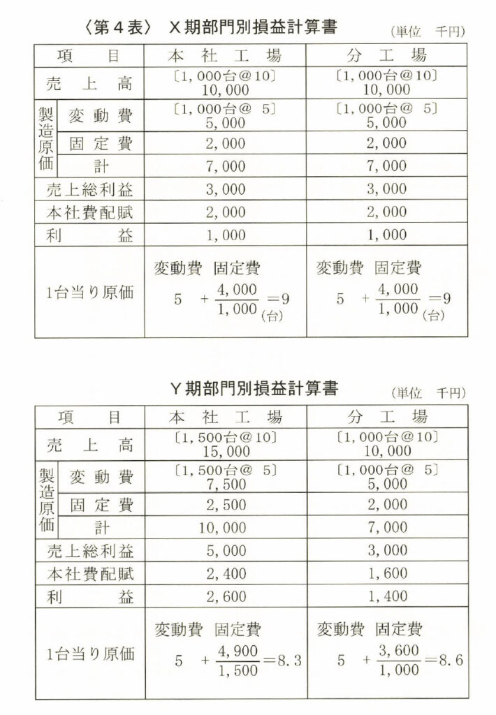 〈第4表)の例題で説明しよう。本社工場と分工場をもつ、ある会社のX期とY期の損益計算の比較である。この計算は、忠実に企業会計原則に従っている。