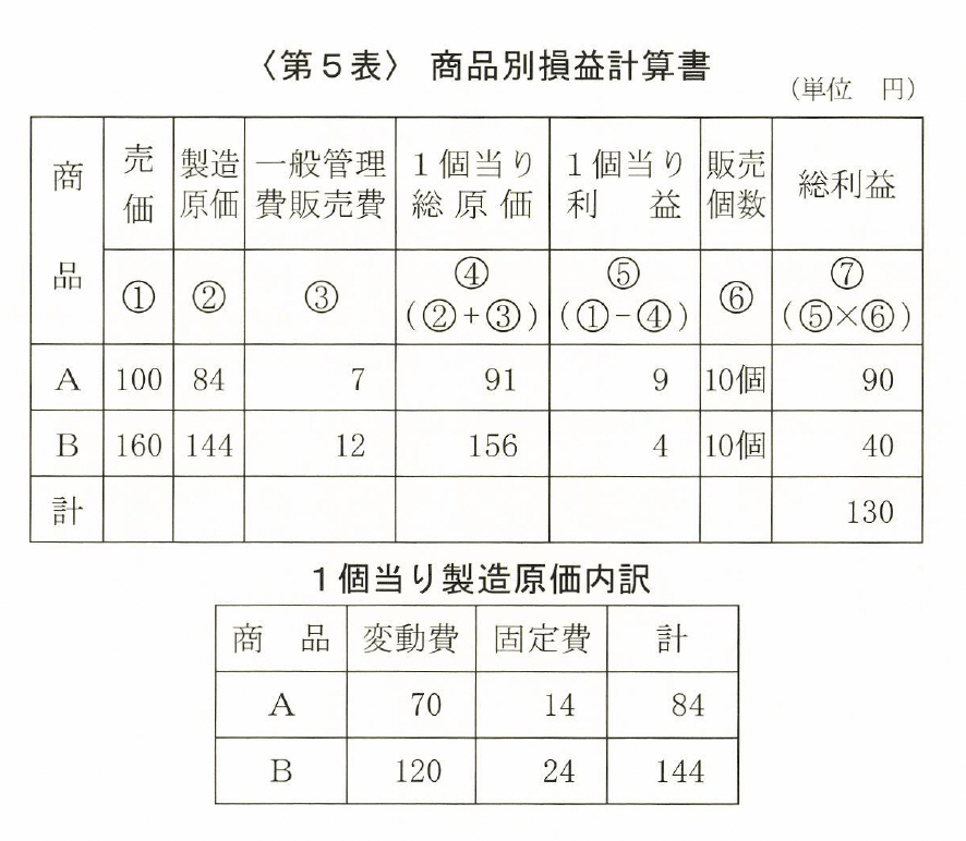 A商品の収益は一個三十円、B商品の収益は一個四十円だから、B商品のほうが一個当り十円収益が多い。