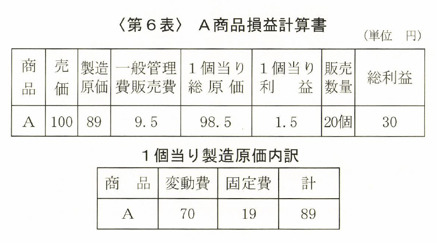 なお細かく内容を見ると、製造原価が五円上がっている。その一個当りの内訳を見ると、変動費は変っていないが固定費が五円上がっていることが分る。さらに一般管理費・販売費が二円五十銭上がっている。そのために総原価が七円五十銭上がってしまったことが分る。