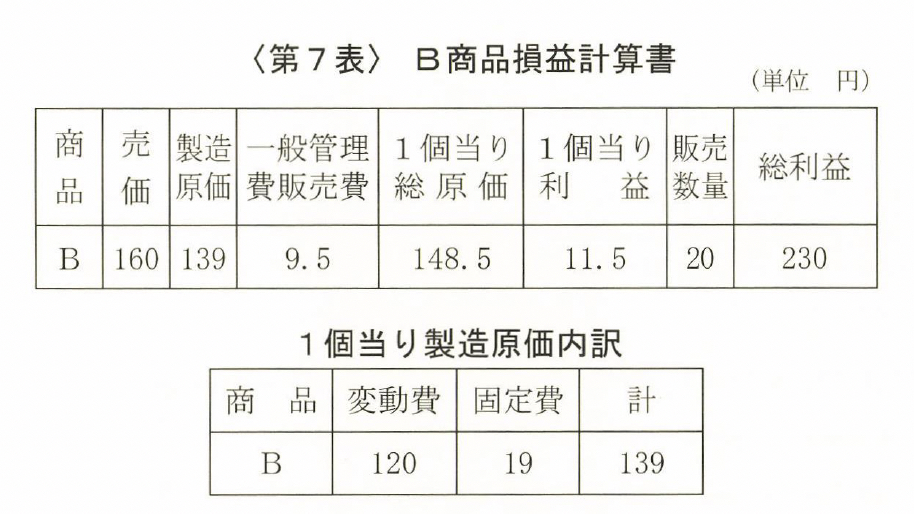 儲けが大きいはずのA商品だけで儲けが少なくなったのなら、儲けが少ないはずのB商品だけを売ったらどうなるだろうか。それが〈第7表〉である。