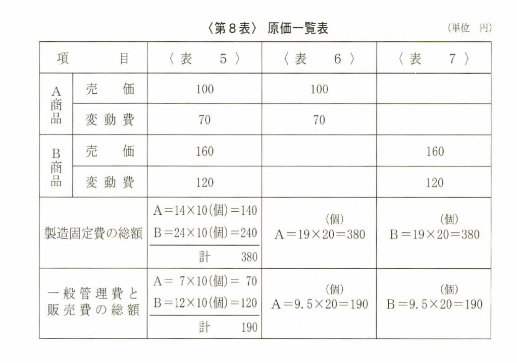 この表を見ると、A商品、B商品とも、売価も変動費も全く変っていない。次に製造固定費の総額である。この計算はそれぞれの商品一個当りに割掛けられた固定費にそれぞれの販売個数をかけて、会社全体の総額に直したものである。一日見れば分るように、三つの場合に全く同額である。