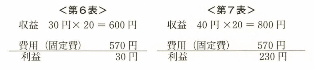 この差が、百三十円の利益が三十円(第6表)となったのであり、反対にA商品十個をやめて、B商品十個を増やせば収益は百円増えて、百三十円の利益が二百三十円になったのである(第7表)。