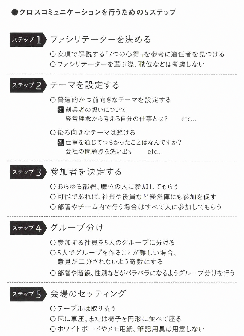 そして、クロスコミュニケーションが職場に根づくまで、ファシリテーターが中心となって自由な語らいの場を盛り上げていかなければなりません。
