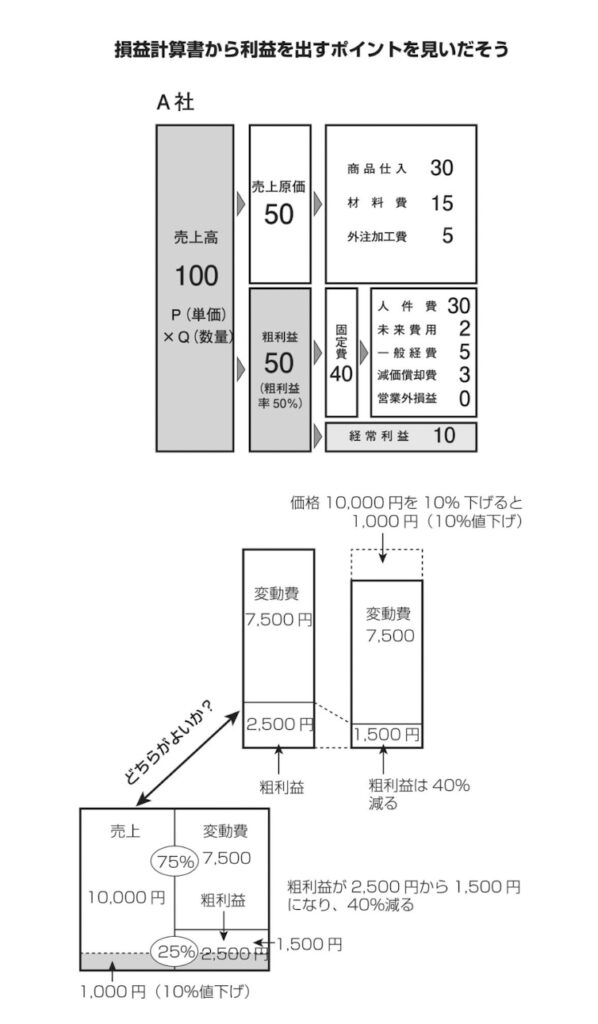 変動費率が10%下がれば粗利益額は20%上がり(50→60)、経常利益は倍(10→20)になります。