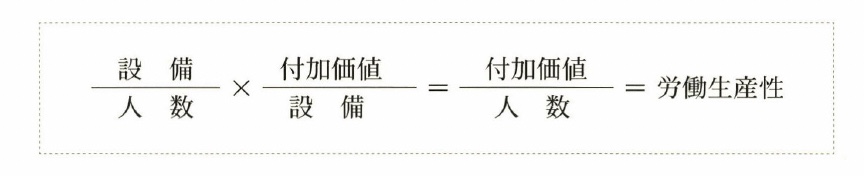 右の式は、労働生産性を設備面から検討する場合の式である。
