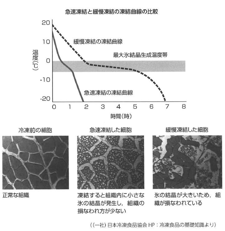 こ の間に水は氷結晶となるが,この温度帯を通過する時間が長いと氷結晶が大 きくなり,食品の組織が大きく損傷を受ける。