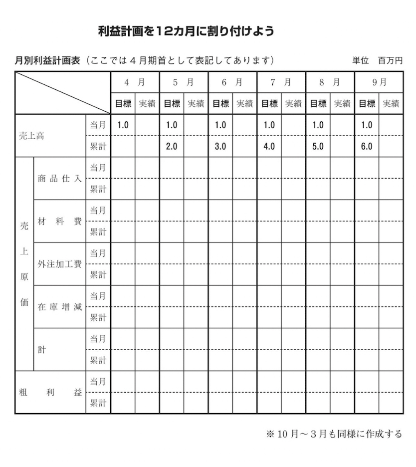 次の表を例として、あなたの会社の月別利益計画表に記入してください。