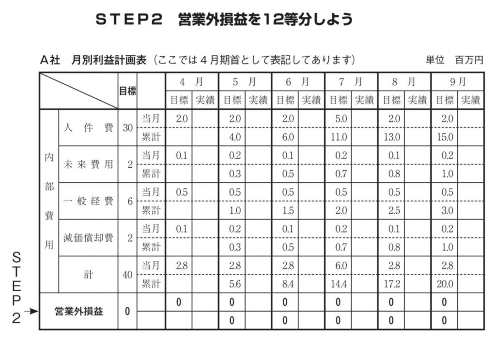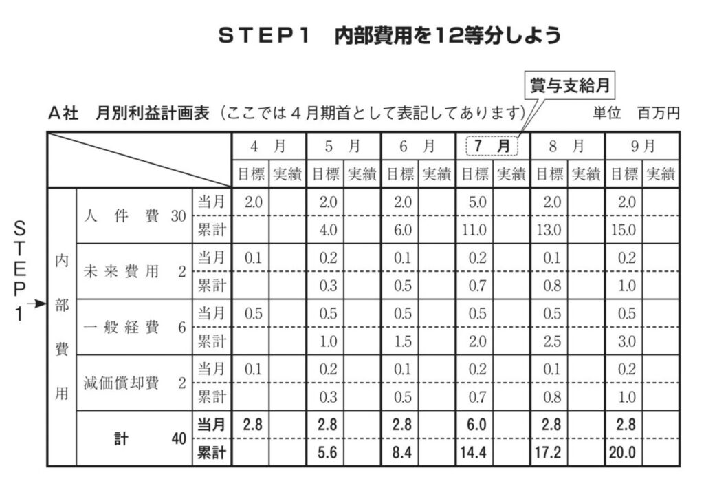 それでは利益計画を12カ月に割り付け、月別利益計画表を作成しましょう。