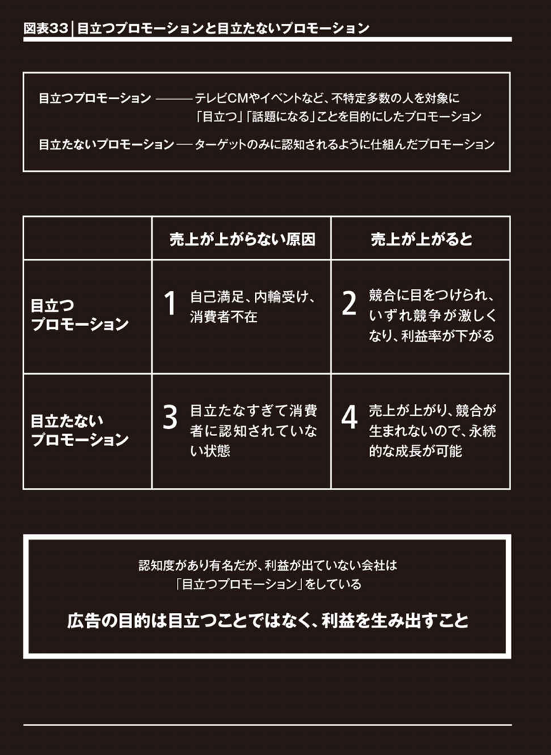 「目立つプロモーション」と「目立たないプロモーション」だ。目立つプロモーションは、テレビCMやイベントなど、不特定多数の人を対象に「目立つ」「話題になる」ことが目的だ。目立つプロモーションで、売上が上がらないケースは、自己満足、内輪受け、消費者不在になっている。一方、売上が上がると、競合に目をつけられ、競争が激しくなり、利益率は下がる。目立つプロモーションは会社にとってメリットがまったくない。テレビCMをたくさん打っても、売上も利益も出ないケースがある。それに対し、目立たないプロモーションは、ターゲットのみに認知されることが目的だ。目立たないプロモーションで売上が上がらないケースは、目立たなすぎてターゲットに認知されていないのだ。一方、目立たないプロモーションで売上が上がると、競合が生まれないので永続的に成長できる。目指すべきはココだ。