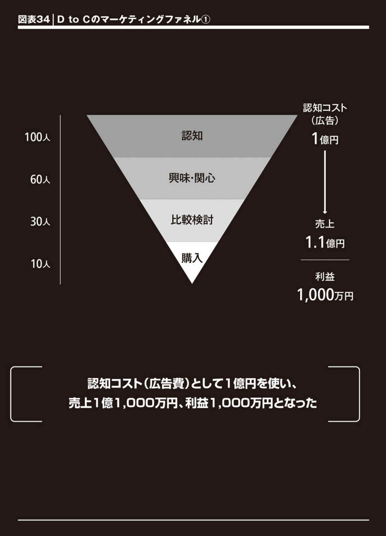 認知コストを1億円から1000万円に下げ、「認知したけれど買わない人」を削り、「買いそうな人だけ」に認知させる。テレビCMを打ったところで見た人の大半は買わない。買わない人に認知してもらうのは無駄。買わない人へのアプローチを一切やめるのだ。