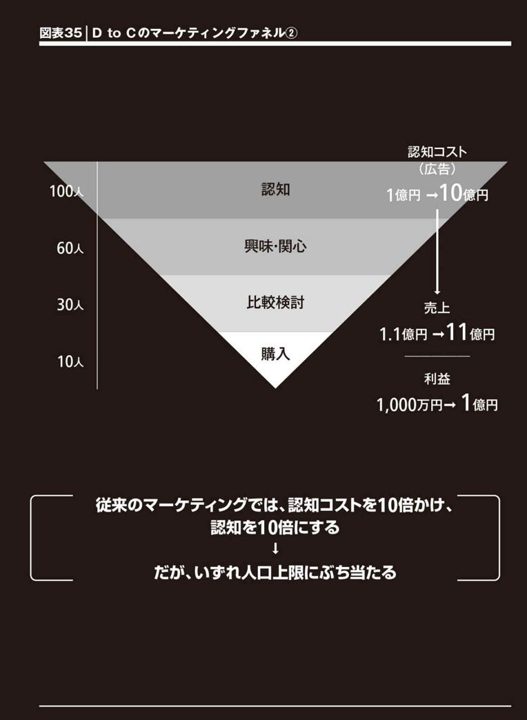 だが、この方法では人口上限という壁にぶつかる。ネット広告でもテレビCMでも、見ている人の数には限りがある。そこでDtoCの場合は、目立たないプロモーションを行う。つまり認知を絞るわけだ。図表36のようなイメージだ。