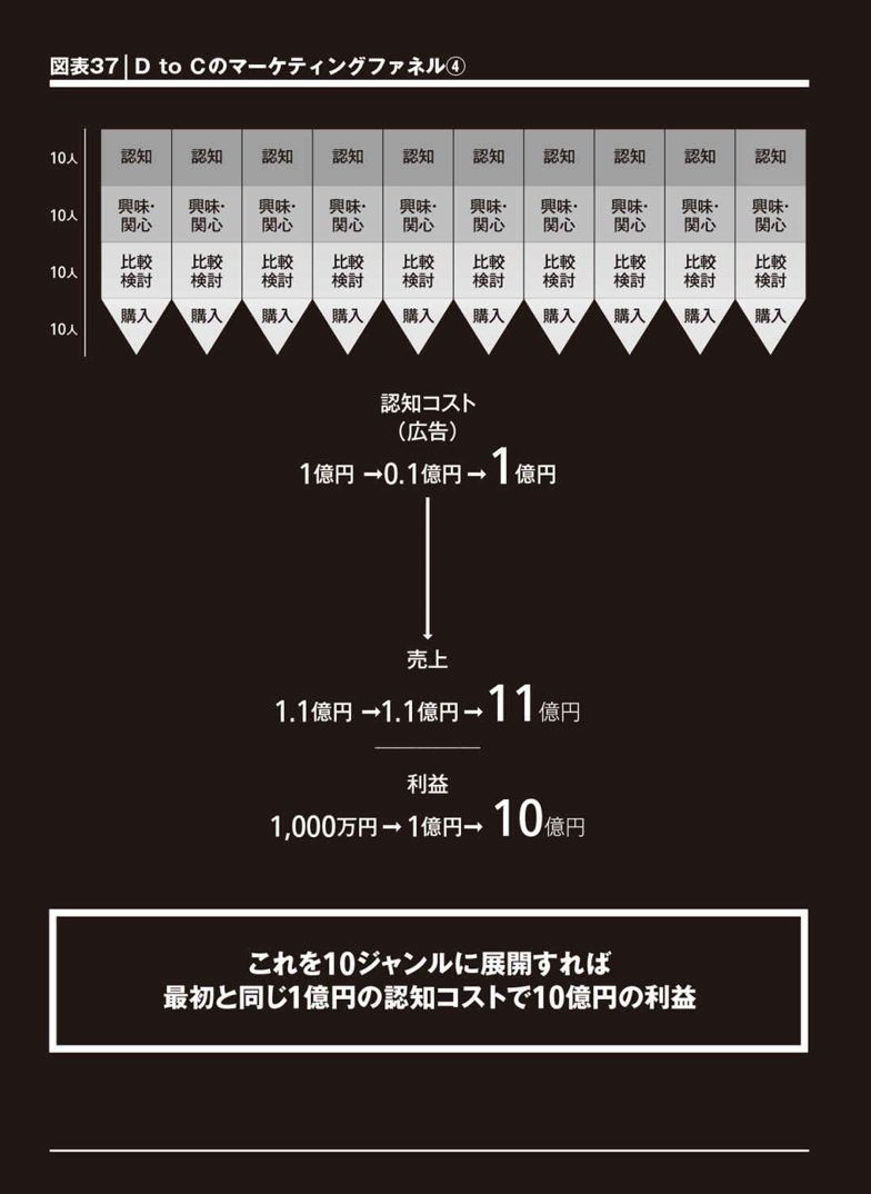 これを10ジャンル(商品)に展開すれば、1億円の認知コストで10億円の利益を上げられる(図表37)。