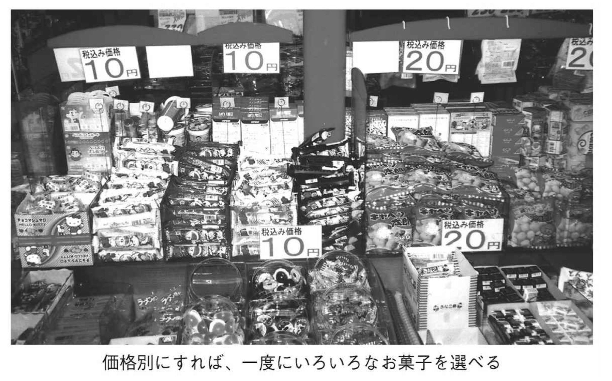 計算も簡単です。子どもにとって、どちらが楽しく買い物ができるでしょう。価格別に並べるメリットはほかにもあります。商品に価格ラベルを貼らなくてすむことです。そのための人手も、経費もいりません。そのぶんさらに安く消費者に提供できます。