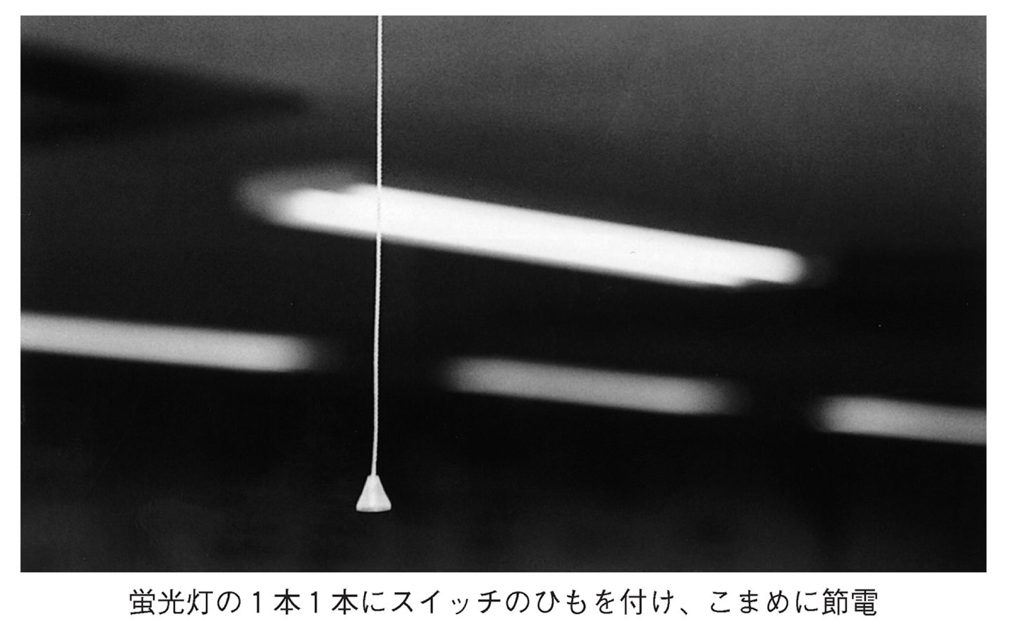 ひもで一本一本の蛍光灯を消し点けできるようにしておけば、必要な人のところの蛍光灯だけを灯して、ほかのところはこまめに消すことができます。
