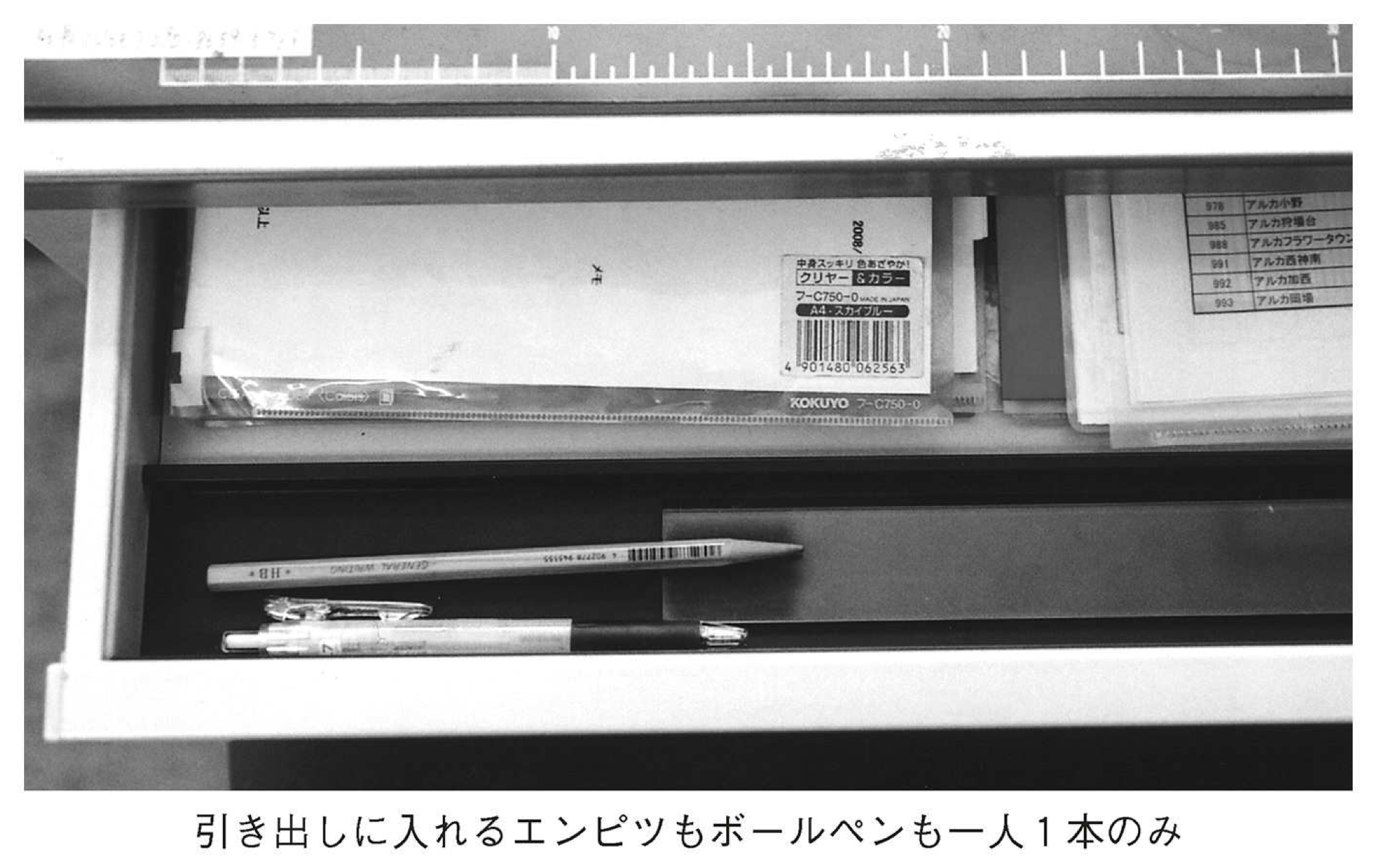 机の引き出しには、エンピツもボールペンも一本