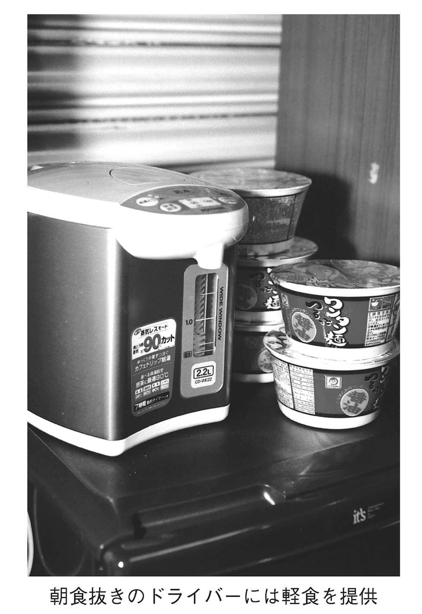 そこで、朝食がまだすんでいないドライバーのために、カップうどんとカップラーメンを用意しました。これも、ドライバーのみなさんにたいへん好評を得ています。