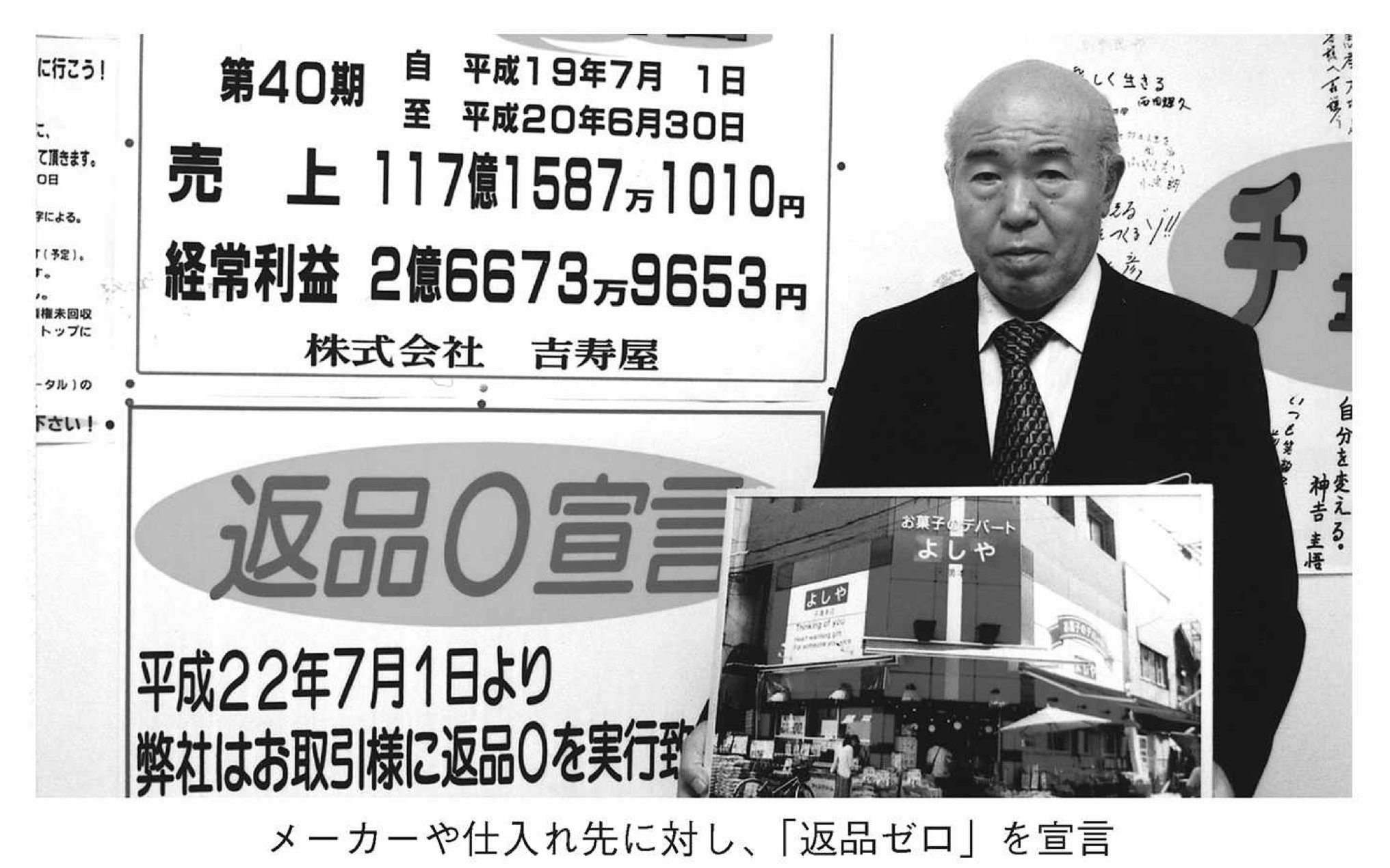 私は平成二十年に、「吉寿屋は平成二十二年七月一日を期して、メーカーや仕入れ先への返品をゼロにします」と公約し、現在そのための準備を進めているところです。
