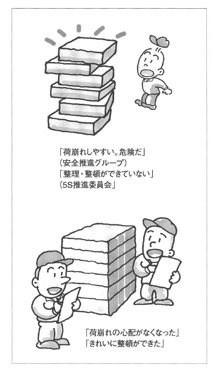 ところがさらに、この乱雑な段ボー ル箱の積み方に関して、5S推進委員 会からは、「整理・整頓ができていな い」と指摘されます。