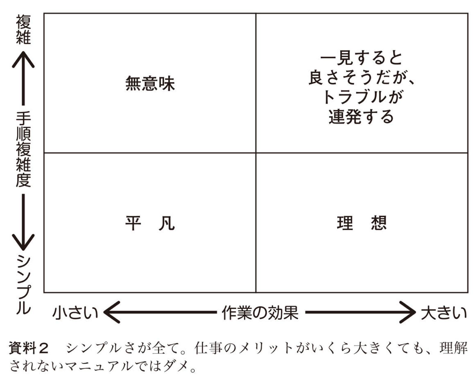 効果が大きくても難しいのでは、効果がゼロなのと同じことである。マニュアルは、有益なことをシンプルに書くことが役目であり、複雑なことを長々と説明してはいけない。