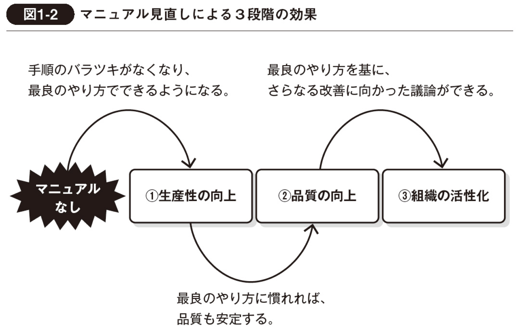 このような外部環境へ即した形へと変化させるだけでなく、マニュアルの見直しは次の3つのような成果をもたらすことが知られています。