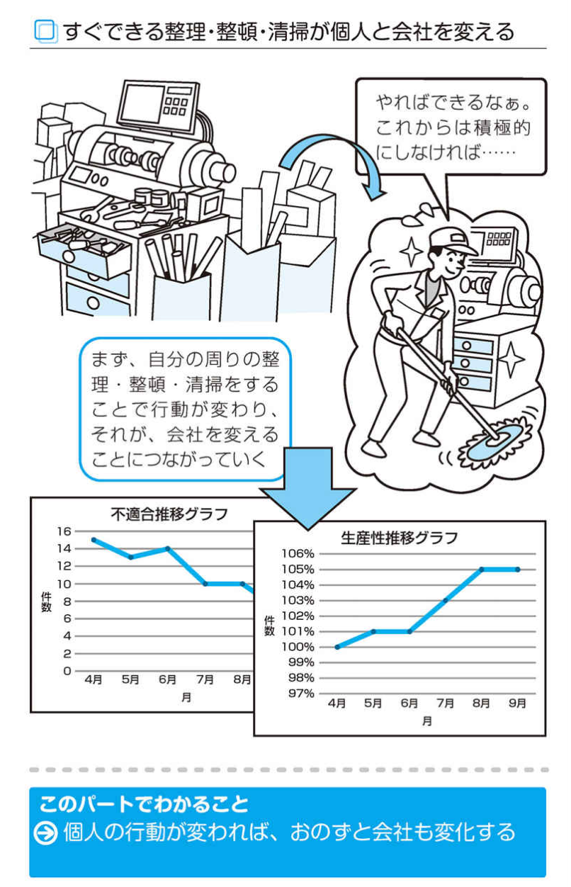 会社で働いている人たちが整理・整頓・清掃が当たり前にできるように変われば、「決められたことが守れる仕事のやり方」「ミスや事故がなくなる仕事のやり方」「探したり聞いたりしない仕事のやり方」になり、その結果、品質がよくなったりコストが下がったりして、会社も変わっていきます。