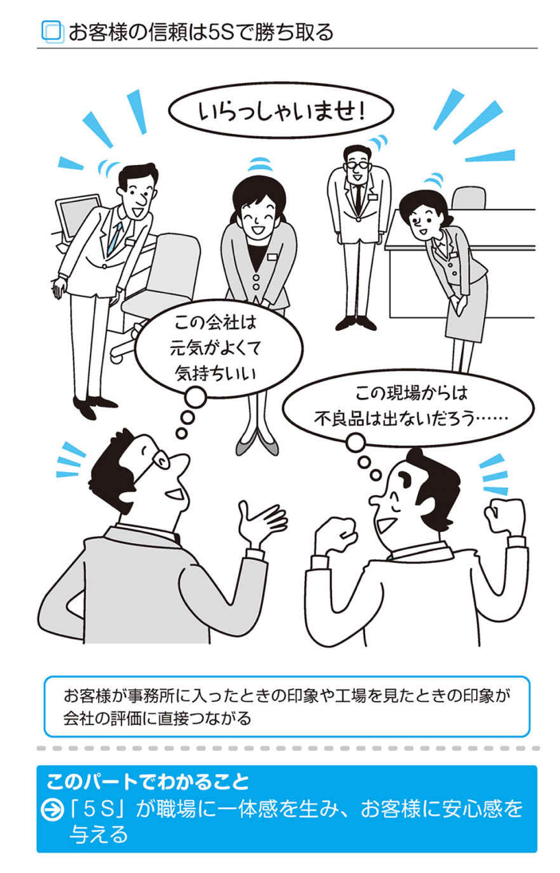 ですから、事務所の机の上から工場の隅々まで整理・整頓・清掃が行き届いた事務所や工場に変えれば「この会社の製品は安心できる」とお客様を安心させ、信用・信頼を得ることができます。