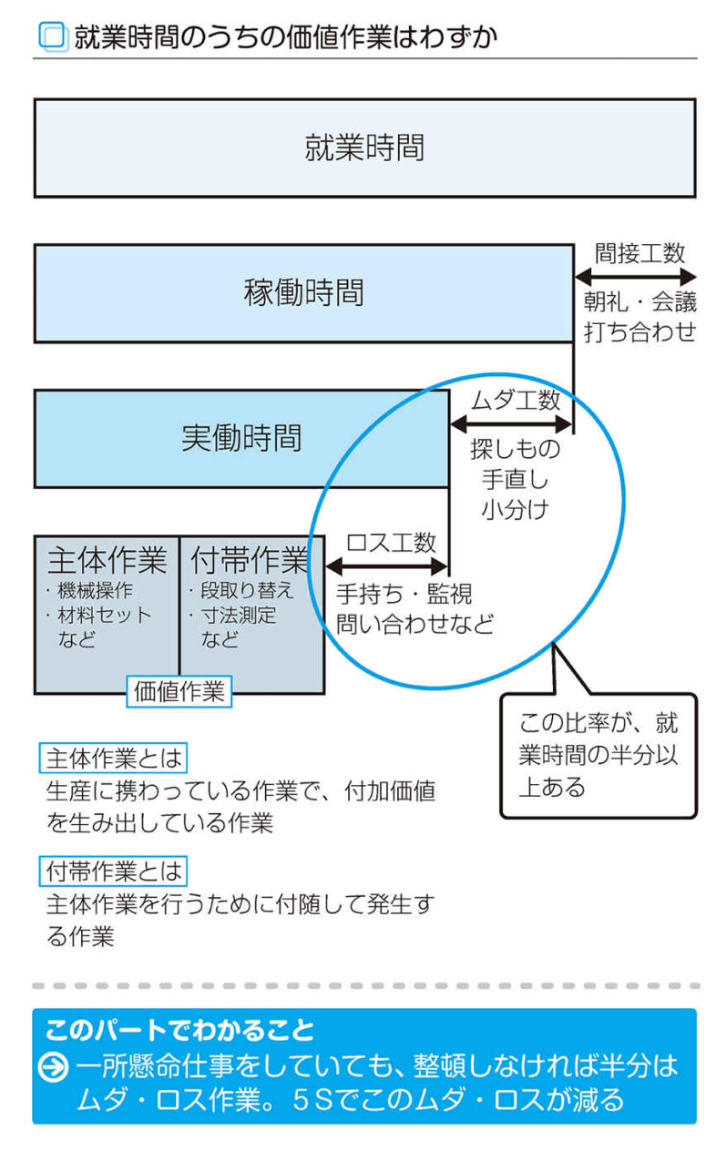 「使ったら元に戻す」「作業する前に必ずチェックする」「決めたところに置く」といったことはわずかな時間でできるのですが、そのわずかな時間でできることを「面倒くさい」と手抜きをした結果、ムダやロスが発生します。
