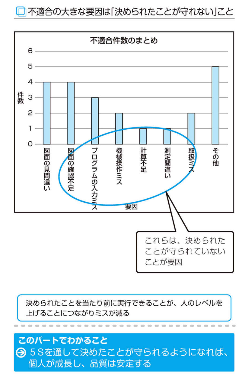 「5Sの取り組みを行えば品質が安定する」といわれるゆえんは、決めたことが守られるようになり、60%以上あるといわれる「決めたことが守られないことによる不適合」が減少するからです。