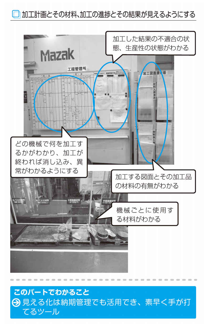 納期を守るためには、置き場所の表示などと同じように、作業計画を見える化し、誰がどの作業をしているか、どの機械で何を加工しているかがわかるようにすることが必要でしょう。